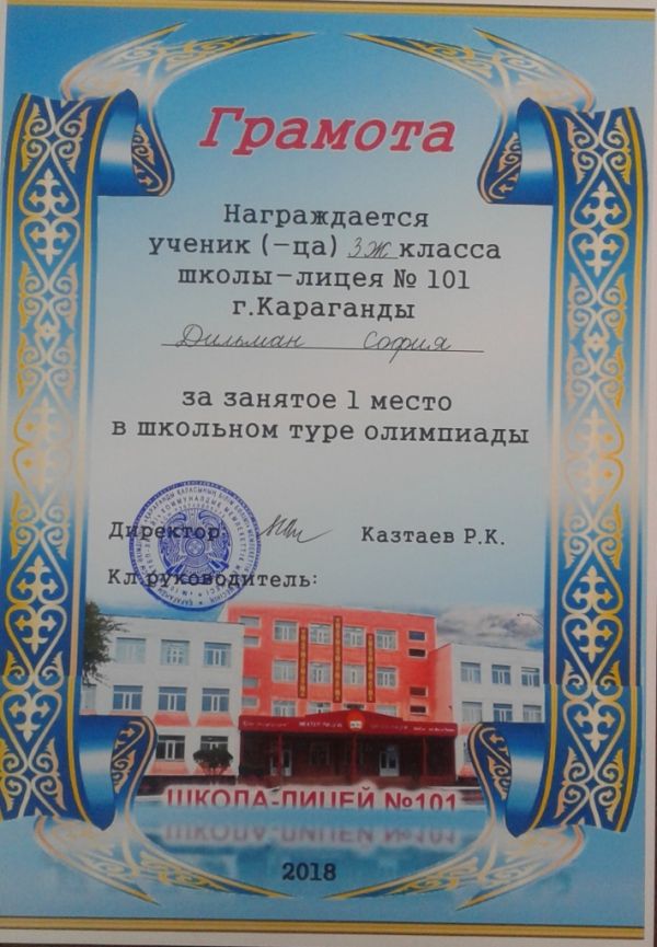 5 ақпанда мектепішілік пәнаралық олимпиада өтті. 3 - сыныптар арасында жеңіс 3 Ж сынып оқушысы Дильман Софияға бұйырды. ҚҰТТЫҚТАЙМЫЗ!!!