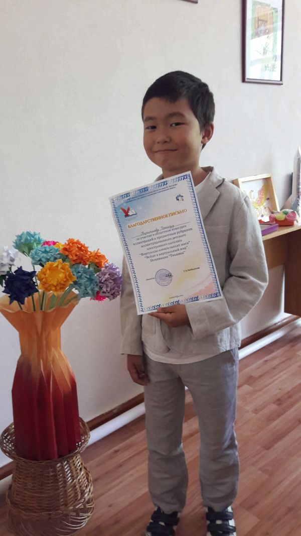 Ученик 1 «Е» класс Каратаев Чингиз за участие в областном конкурсе иллюстраций к предметным рубрикам иллюстрированного детского электронного каталога «Виртуалды әлемде саяхат…