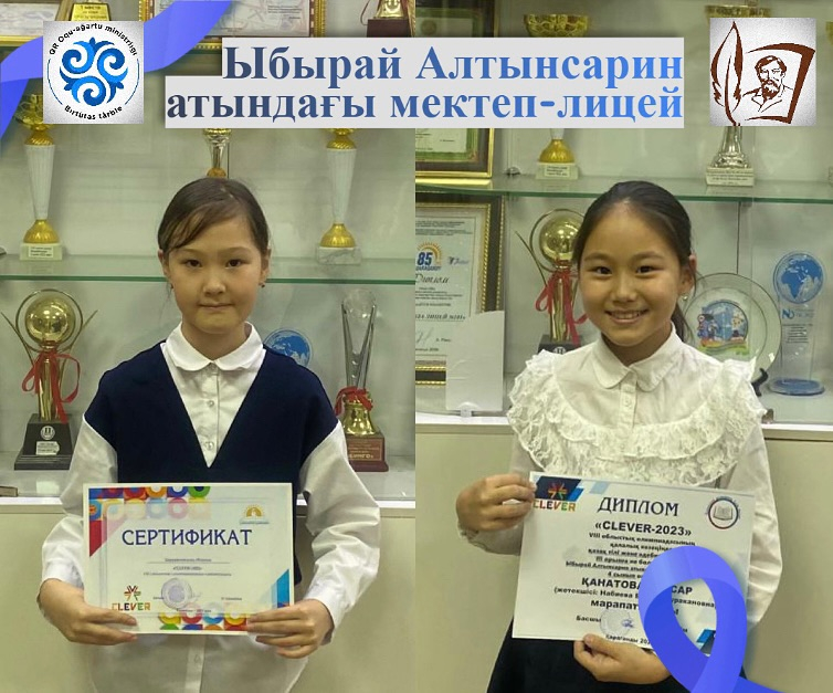 CLEVER - 2023” VIII облыстық олимпиадасының қалалық кезеңінде 4 “Ә “ сынып оқушылары Қанатова Кәусар қазақ тілі және әдебиет пәнінен Бауыржанқызы Жасмин ағылшын пәніне 1 орынды ием…