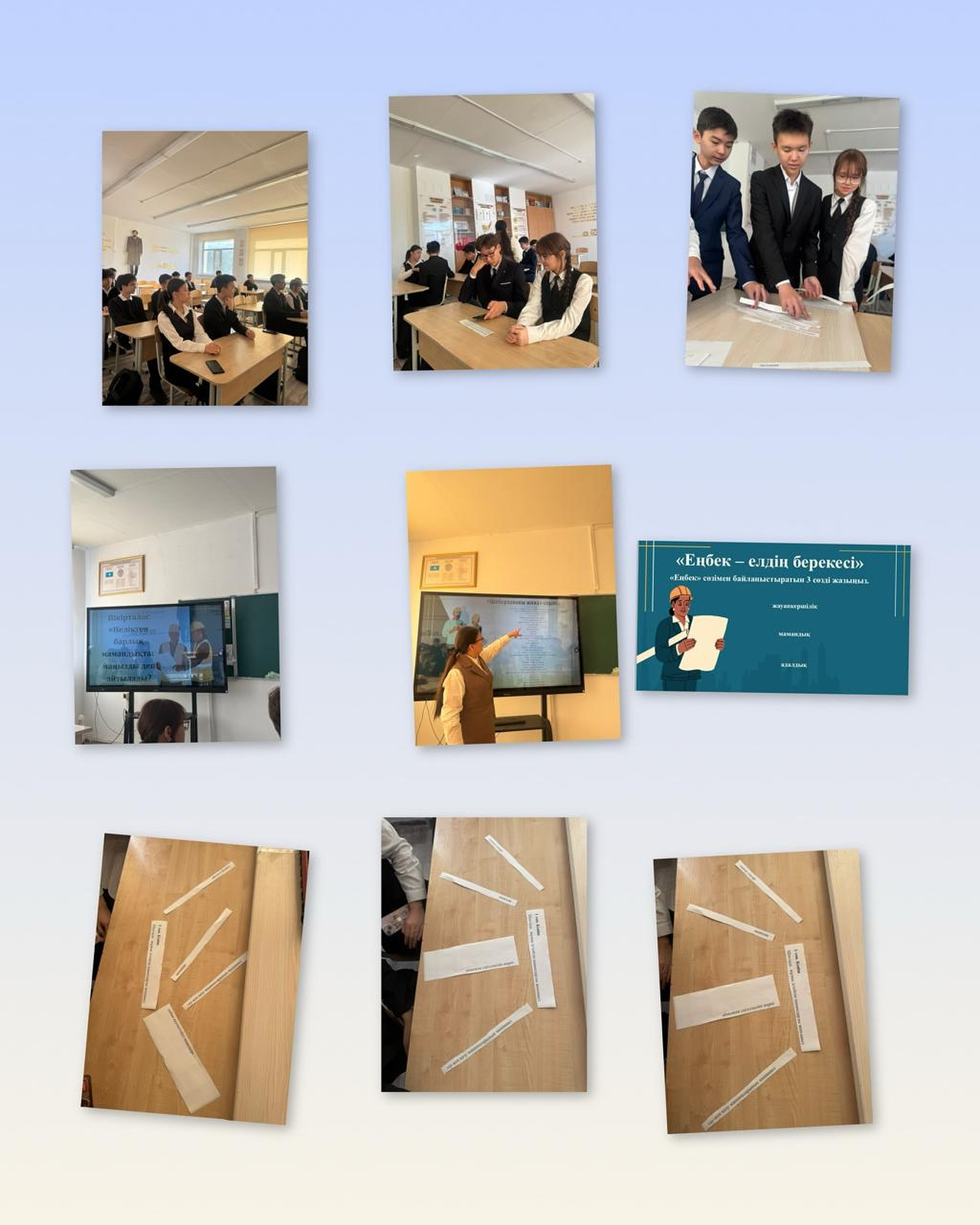 2025 жылдың 22 қыркүйегінде 10 «Ә» сыныбында «Адал азамат» біртұтас тәрбие бағдарламасы аясында «Еңбек - елдің берекесі» атты еңбек күніне арналған сынып сағаты ө…
