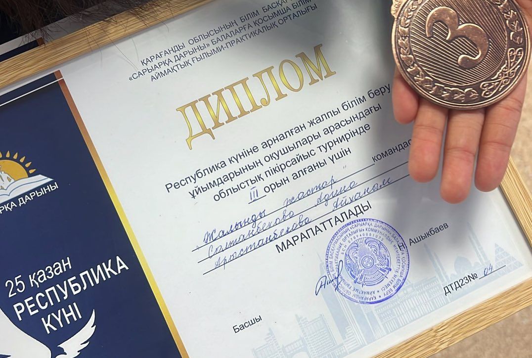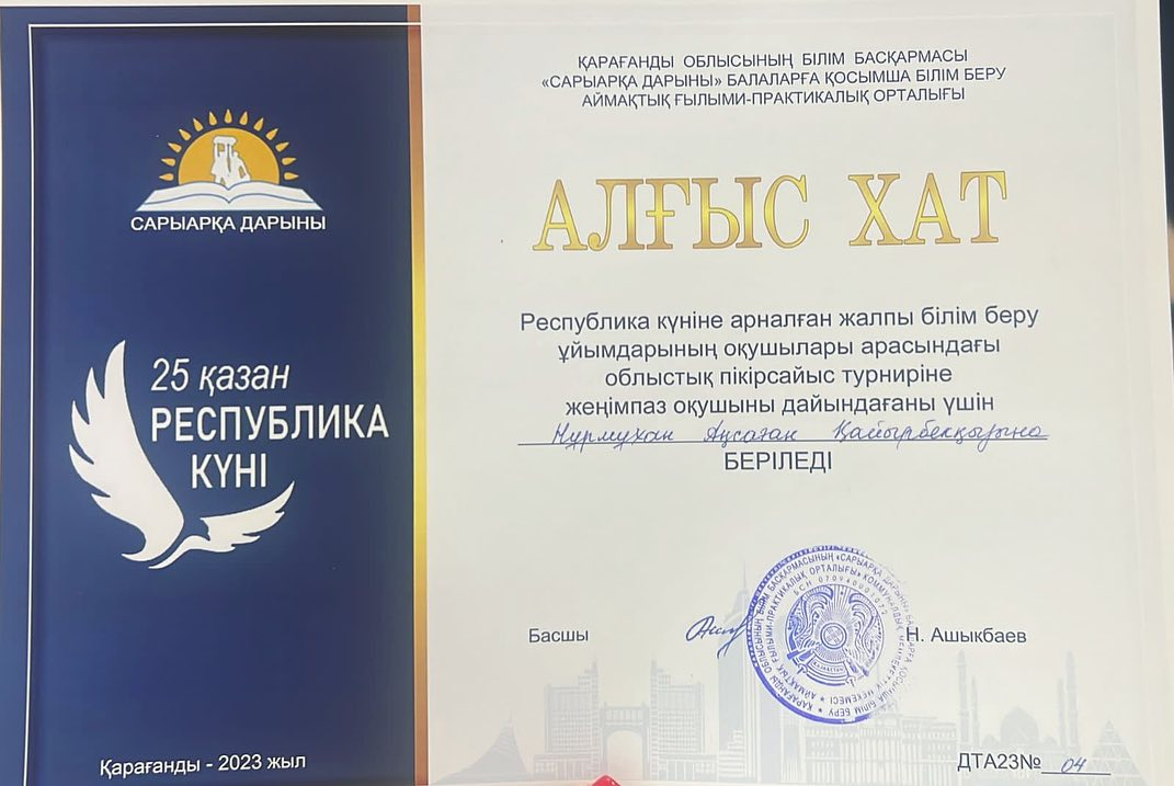25 қазан Республика күніне арналған жалпы білім беру ұйымдарының оқушылары арасындағы облыстық дебат турнирінен III орынды мектебіміздің “Жалынды ЖАСТАР» командасы иеленді. Оқушылар: С…