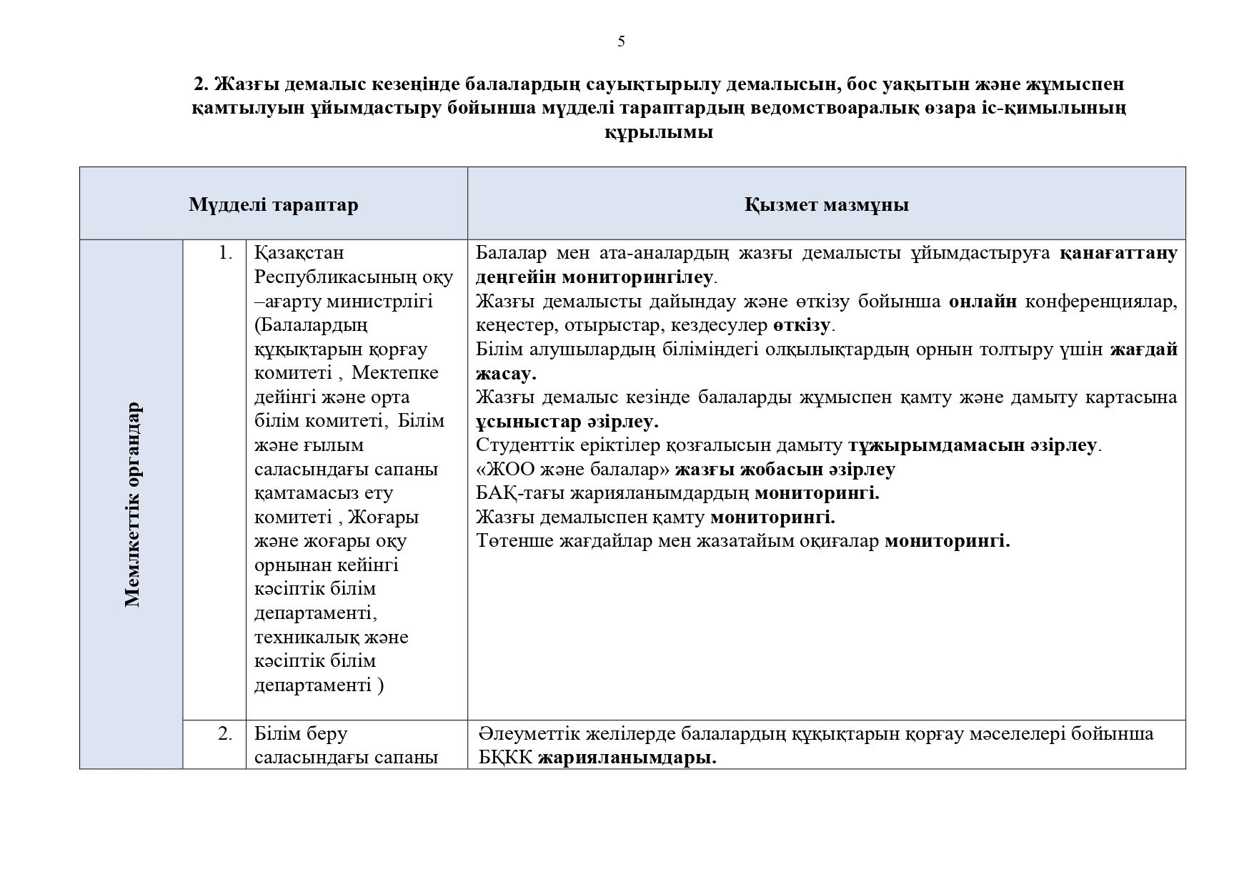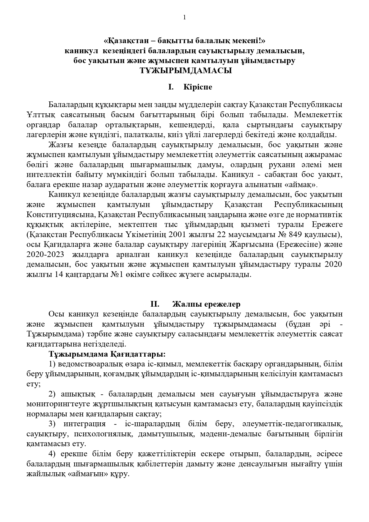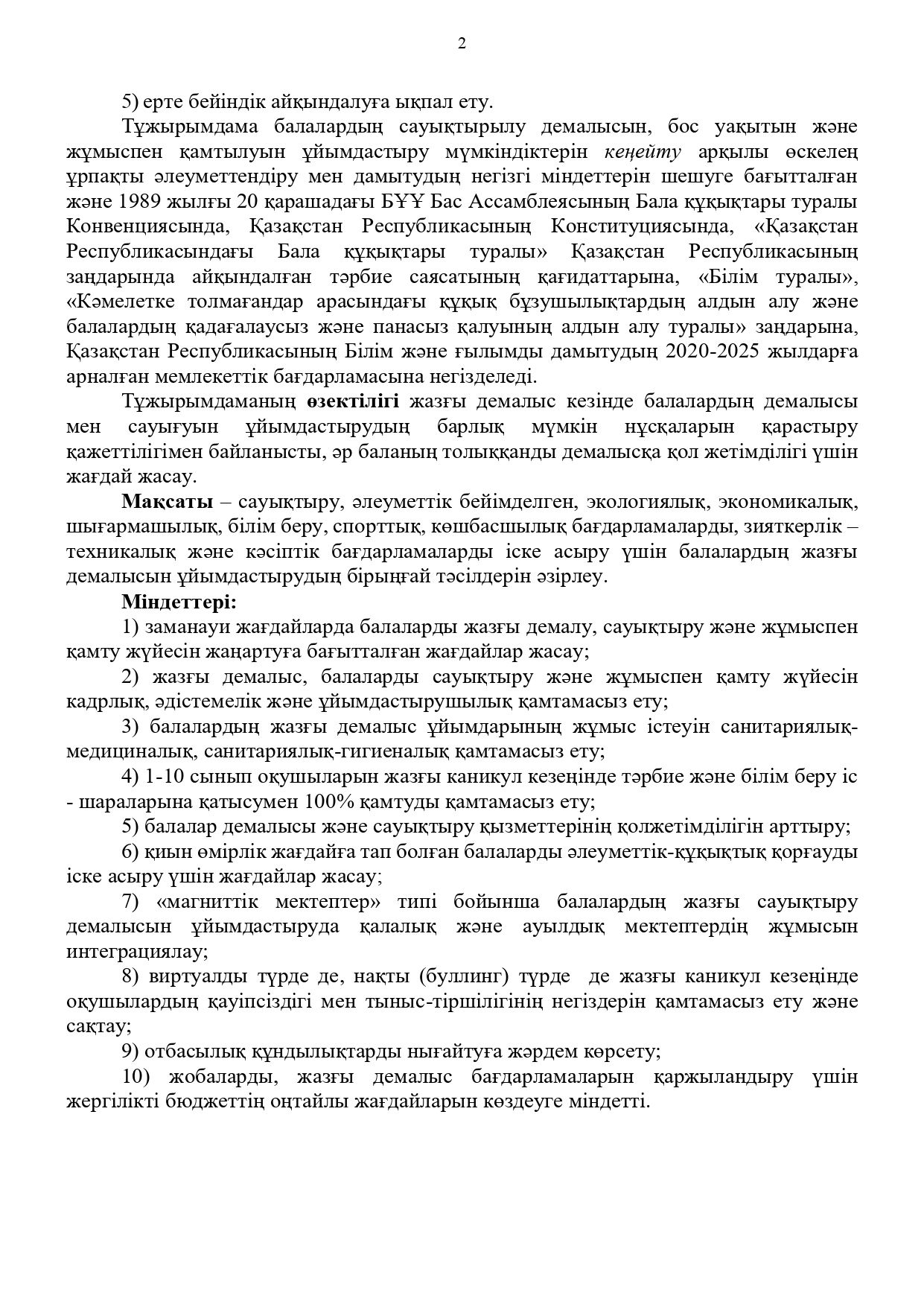 «Қазақстан – бақытты балалық мекені!» каникул кезеңіндегі балалардың сауықтырылу демалысын, бос уақытын және жұмыспен қамтылуын ұйымдастыру ТҰЖЫРЫМДАМАСЫ