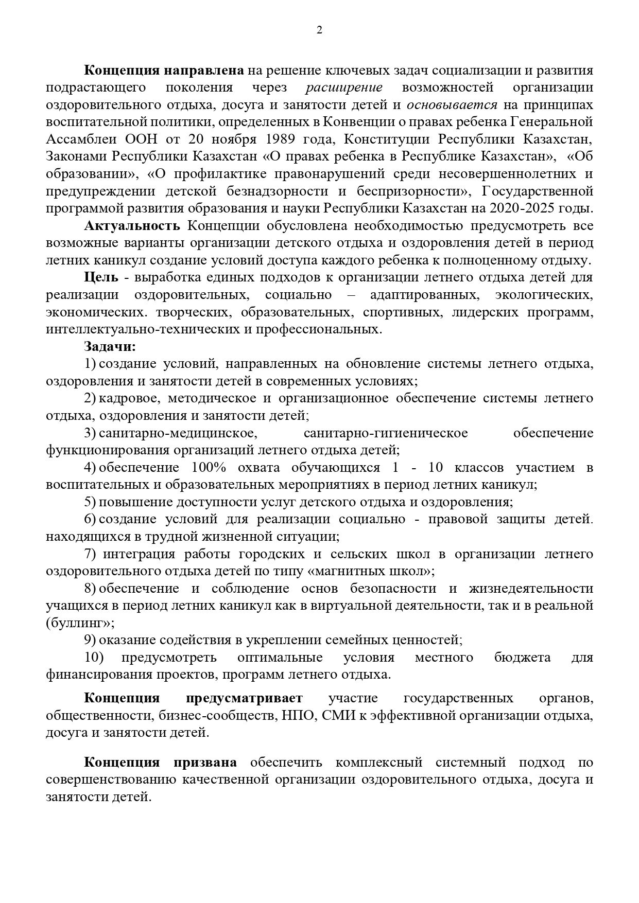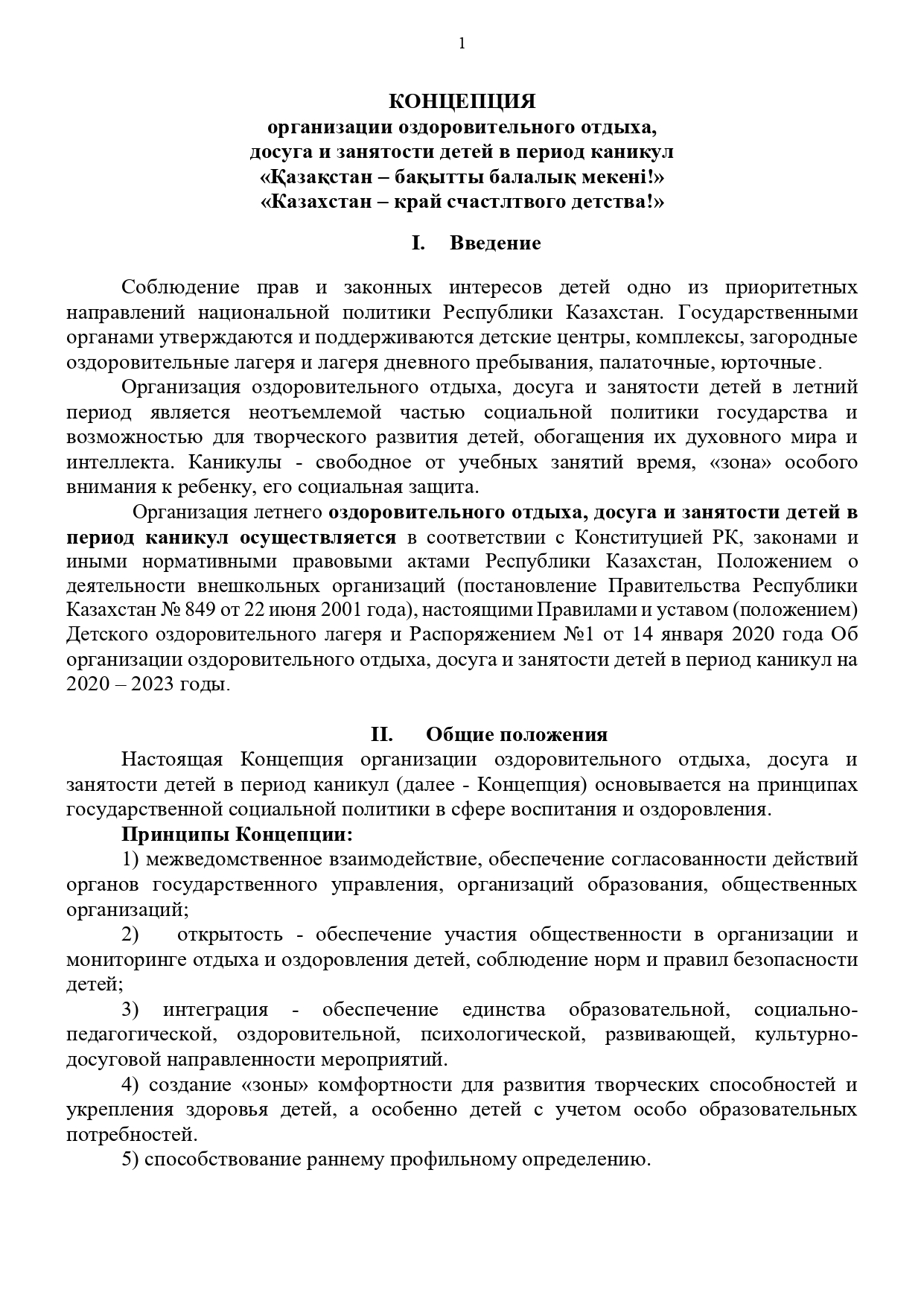КОНЦЕПЦИЯ организации оздоровительного отдыха, досуга и занятости детей в период каникул «Қазақстан – бақытты балалық мекені!» «Казахстан – край счастлтвого детства!»