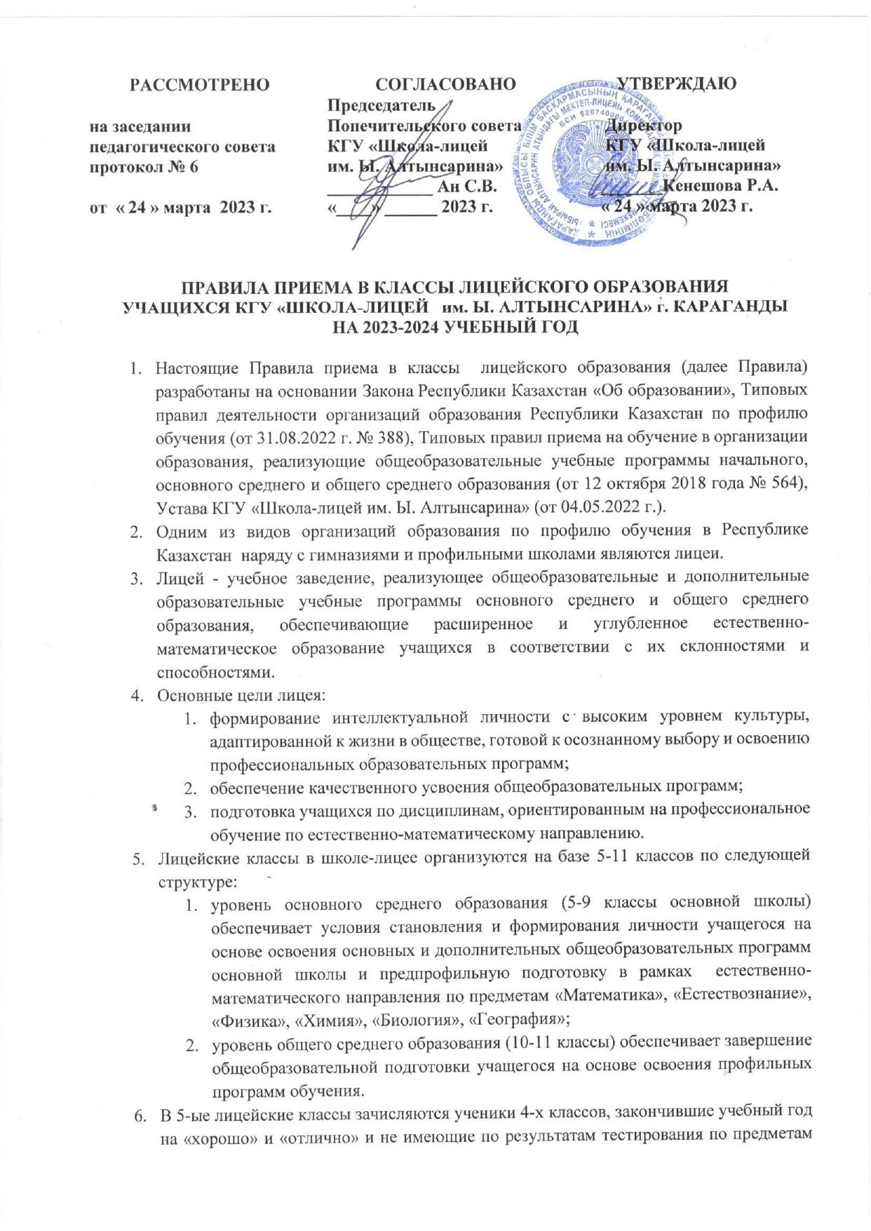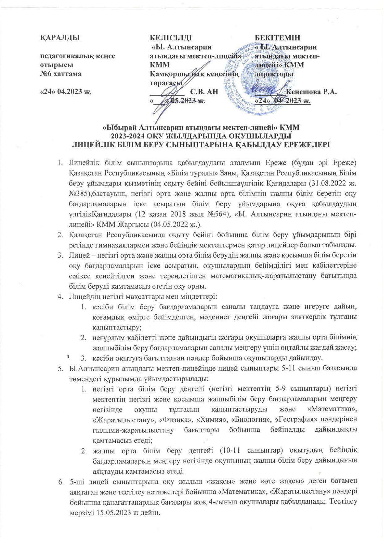 "Ыбырай Алтынсарин атындағы мектеп-лицей"" КММ 2023-2024 оқу жылдарында оқушыларды лицейлік білім беру сыныптарына қабылдау ережелері
