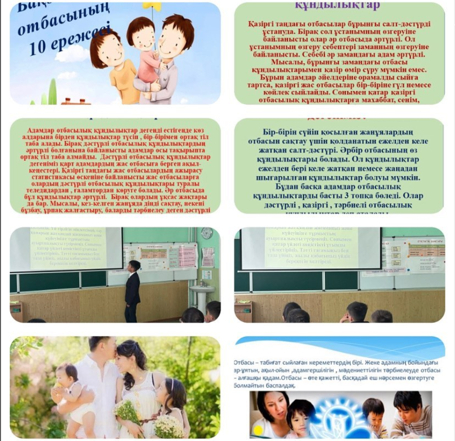 “Халықаралық отбасы күніне ” арналған сынып сағаты 4ә сыныбында өтті. Отбасы құндылықтардың дәстүрлі , қазіргі, тәрбиелік отбасылық болып бөлінетінін. Отбасының бақытты болуы үшін 10 ере…