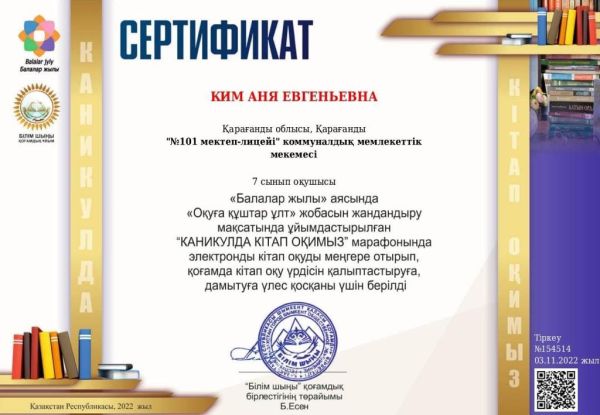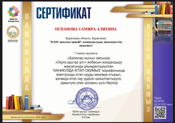 “Оқуға құштар мектеп” жобасын жандандыру мақсатында ұйымдастырылған «КАНИКУЛДА КІТАП ОҚИМЫЗ» республиқалық марафонына қатысып 7 &ldq…
