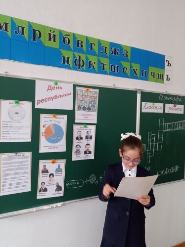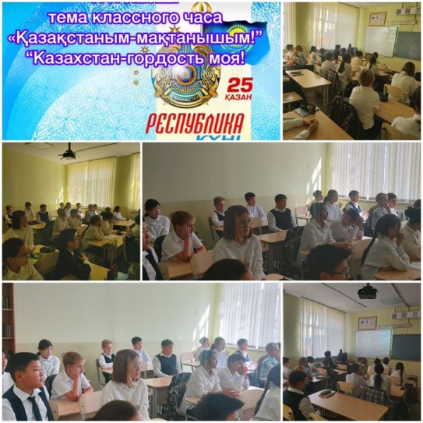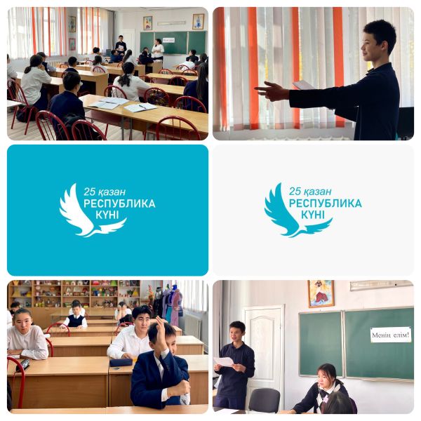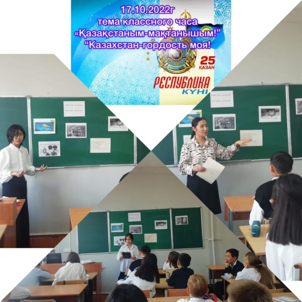 17 қазанда 4-сыныпта Республика күнін мерекелеуге арналған сынып сағаты өтті. Балалар Қазақстан туралы не білетіндері, қайда барғандары және өз елі үшін не істей алатыны туралы айтты.