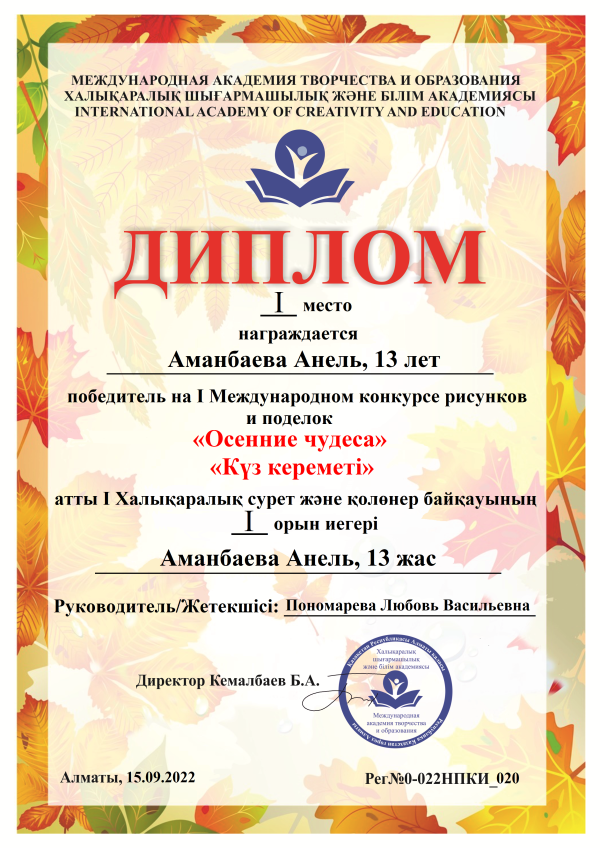 "Күзгі ғажайыптар" I Халықаралық суреттер мен қолдан жасалған бұйымдар байқауының қорытындысы бойынша 8 "Г" сынып оқушысы Анель Аманбаева "қол қолдан жасалған бұйымдар"…
