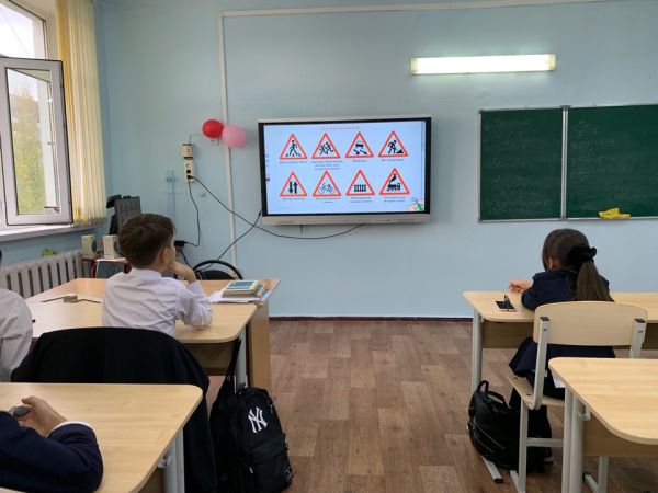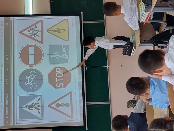 Мұғалім оқушыларға жаяу жүргіншілер мен жүргізушілер үшін жол белгілерінің маңыздылығын…