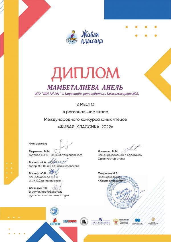 Поздравляем Мамбеталиеву Анель ! 2место в региональном этапе Международного конкурса юных чтецов Живая классика 2022