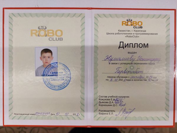 Дипломом с отличием отмечен ученик 2 "З" класса Жумалиев Искандер . Школа робототехники и программирования " RoboClub".