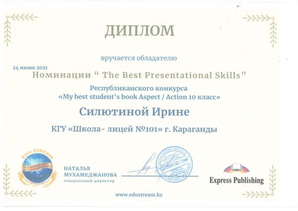 Ученица 11 А класса Силютина Ирина получила номинацию “Thebestpresentationskills” в Республиканском конкурсе от издательства учебников английского языка “ExpressPublishing”.&…