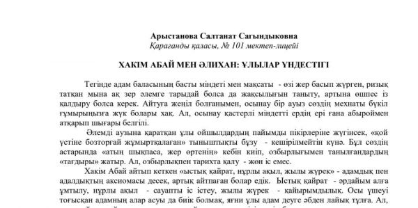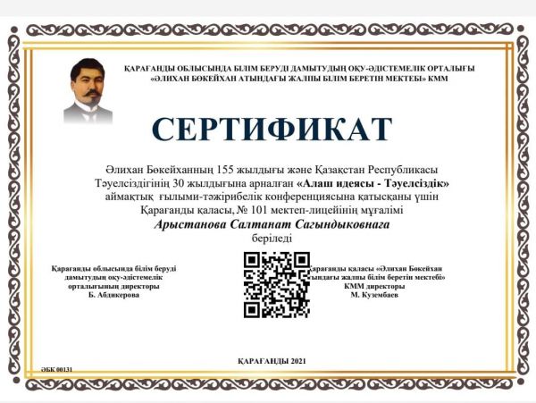 "Алаш идеясы-Тәуелсіздік" аймақтық ғылыми-тәжірибелік конференциясына Қарағанды қаласындағы №101 мектеп-лицейінің қазақ тілі мен әдебиеті мұғалімі Арыстанова Салтанат Сагындыко…