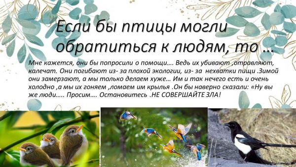 Если бы птицы могли говорить, то они попросили бы людей не совершать зла: не убивать их, не ломать им крылья…