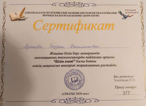 2020-2021 оқу жылындағы ерекше жетістігі, ел ертеңі жас ұрпаққа сапалы білім, саналы тәрбие беру жолында аянбай еңбек етіп, жаңартылған білім мазмұны бойынша мақаласын жоғары деңгейде д…