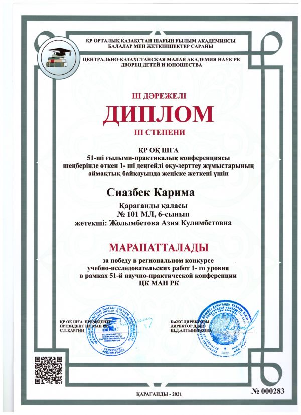 51-ші ғылыми-практикалық конференциясы шеңберінде өткен 1-ші деңгейлі оқу-зерттеу жұмыстарының аймақтық байқауында жеңіске жеткен 6 «Ә» сынып оқушысы Сиазбек Карима.