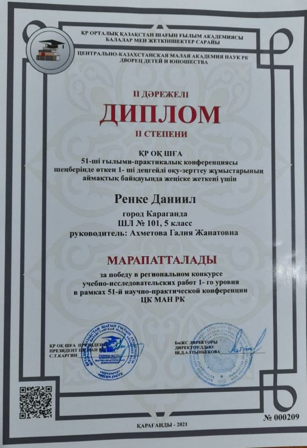 Поздравляем учащегося 5Е класса Ренке Даниила с победой в региональном конкурсе учебно-исследовательских работ 1-го уровня в рамках 51-й научно-практической конференции ЦК МАН РК!