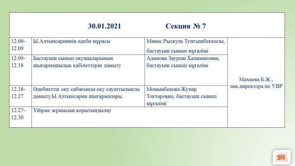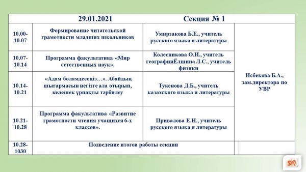 29-30.01.2021 «Замануи білім беру контексіндегі Ыбырай Алтынсарин мұралары» педагогикалық оқулар аясында секциялық отырыстар өткізілді, оған зерттеуші-педагогтар мен аттестатталат…