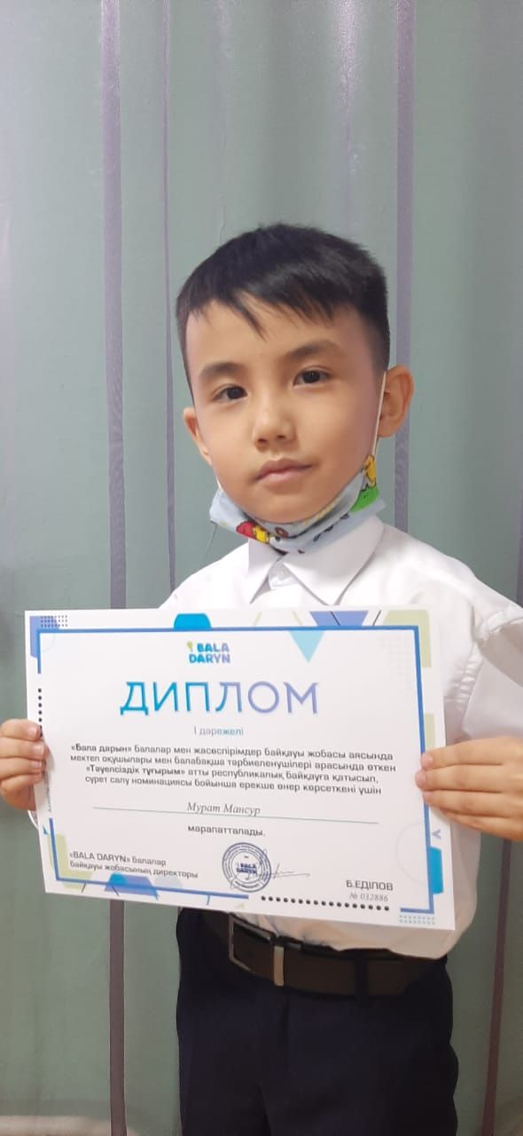 2 В сынып оқушысы Мурат Мансур Республикалық шығармашылық байқауында,"Сырлы суреттер" тақырыбында 1 орынды иеленген үшін дипломмен "Өрлеу порталы" марапаттады .
