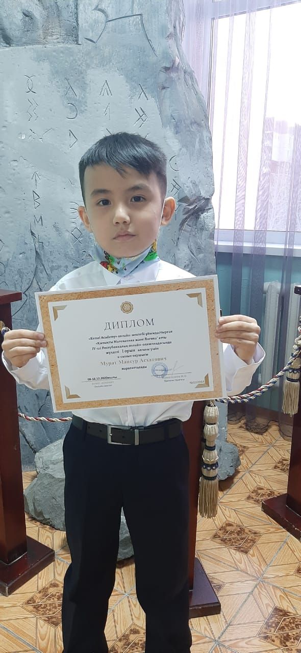 2 В сынып оқушысы Мурат Мансур "Бастауыш сыныптар" пәні бойынша Республикалық қашықтық олимпиадасының жеңімпазы атанып, 1 дәрежелі дипломмен марапатталды.