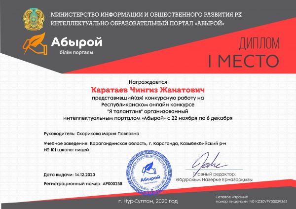 По итогам Республиканского онлайн конкурса «Я талантлив», организованным интеллектуальным порталом «Абырой» Каратаев Чингиз, ученик 6ж класса занял 1 место и н…