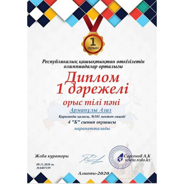 Құттықтаймыз! 4 сынып оқушылары арасында орыс тілі пәні бойынша Жалпықазақстандық олимпиаданың жеңімпазы атанып 1 орынға ие болған 4 «Б» сынып оқушысы Арманұлы Азиз Дипломмен марапатталд…