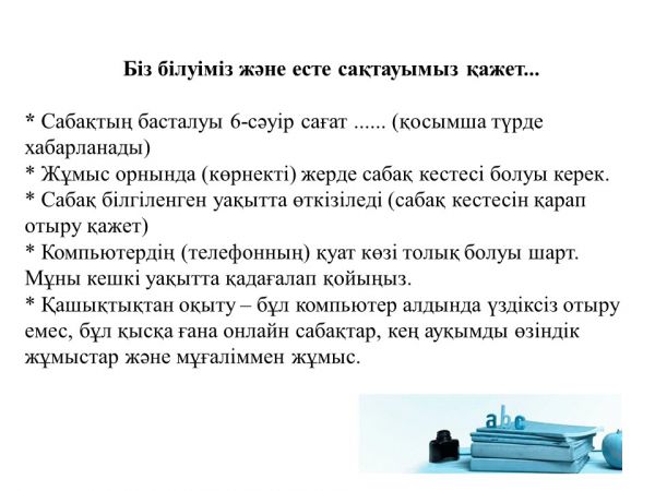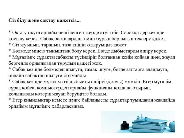 В период с 6 апреля 2020 года организации среднего образования Республики Казахстан переходят на обучение с использованием дистанционных технологий, которые предполагают взаимоде…