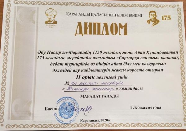 Абай Құнанбайұлының 175 жылдық мерей тойы, Әбу-Насыр Әль-Фарабидің 1150 жылдық мерей тойы аясындағы «Сарыарқа Саңлағы» дебат турнирінде өз пікірін айта білу мен көзқарасын д…