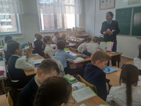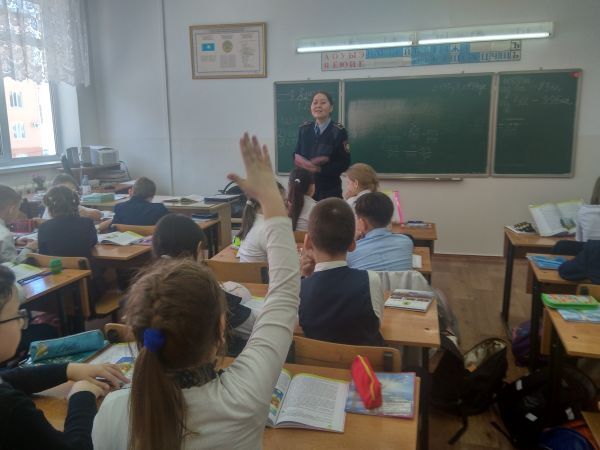 "Қауіпсіз мектеп" жедел-алдын алу іс-шарасы аясында 11 наурыз күні Оңтүстік-Шығыс ПБ МӨББ полиция майоры А.С.Дюсебаева 4 сынып оқушылары арасында "Қауіпсіздік бағыты" тақы…