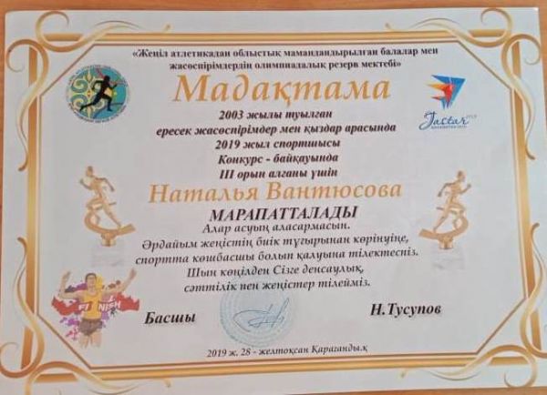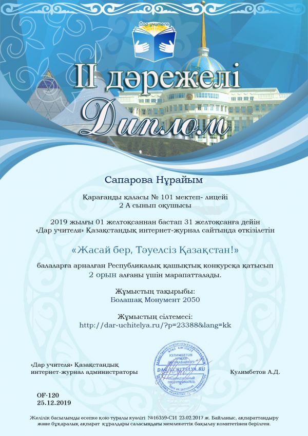 Республикалық Ұлттық Интернет Олимпиадасынан қазақ тілі пәнінен ұйымдастырхан қашықтық олимпиадасының жеңімпазы 4Б сынып оқушысы Ермаханова Ақару 1 дәрежелі дипломмен марапатталды.
