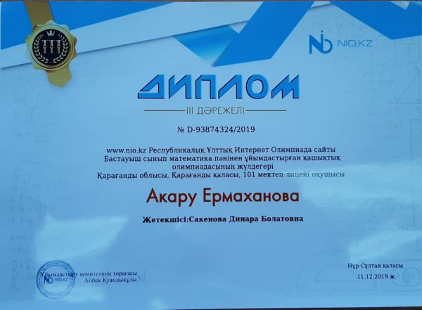 Республикалық Ұлттық Интернет Олимпиадасынан математика пәнінен ұйымдастырхан қашықтық олимпиадасының жеңімпазы 4Б сынып оқушысы Ермаханова Ақару 3 дәрежелі дипломмен марапатталды.