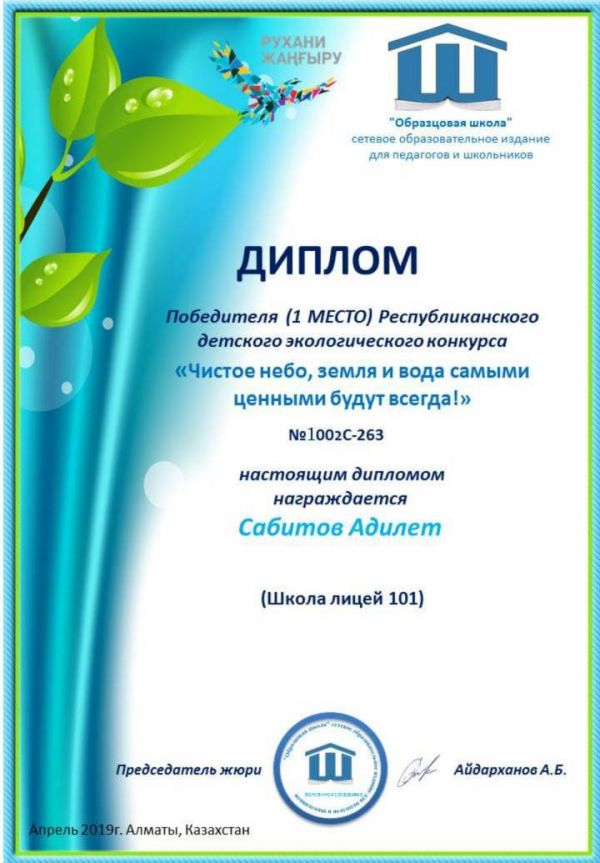 Сабитов Әділет "Таза аспан, жер және су әрқашан құнды болады!" атты республикалық балалар экологиялық байқауында І орын алды.