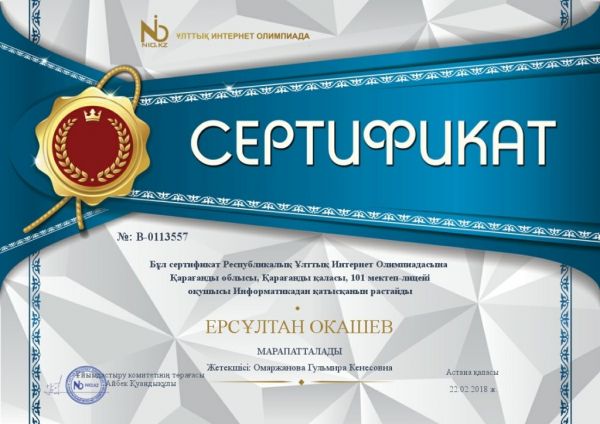2018 жылдың ақпан айында информатика пәні бойынша өткен Республикалық Ұлттық Интернет Олимпиадаға КММ «№101 мектеп-лицейінің» 7 «А» сыныбынан оқушылар қатысып жүлделі орындар…