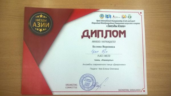 Поздравляем ученицу 3Д класса КГУ «Школа – лицей №101» Белову Веронику за победу в Открытом Международном Чемпионате искусств и спорта «Звёзды Азии». За занятое Г…