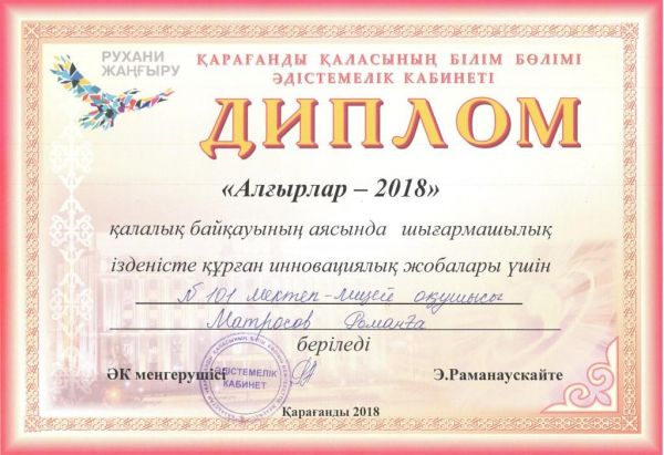 2 марта 2018 г. состоялся VIII городской фестиваль «Алғырлар-2018». На пленарном заседании с защитой своего проекта «Умная школа» выступил Матросов Роман, ученик 7 г класса,…