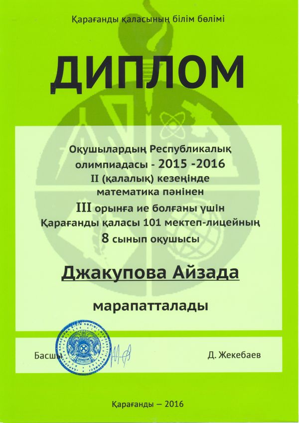 Оқушылардың Республикалық олимпиадасының ІІ(қалалық) кезеңінде математика пәнінен ІІІ орынға ие болғаны үшін №101 мектеп-лицейінің 8-сынып оқушысы Джакупова Айзаданы құттықтаймыз.
