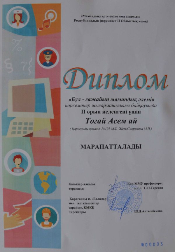 По итогам второго областного этапа Республиканского форума «Открываем мир профессий» ученица 8 «Б» класса Тогай Асем Ай за представленную работу получила диплом за 2 ме…