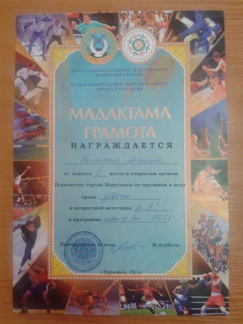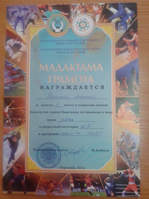 Ученица 4Л класса ШЛ №101 Пилецкая Ангелина заняла 2-место в открытом личном Первенстве города Караганды по прыжкам в воду. Желаем Ангелине новых побед.