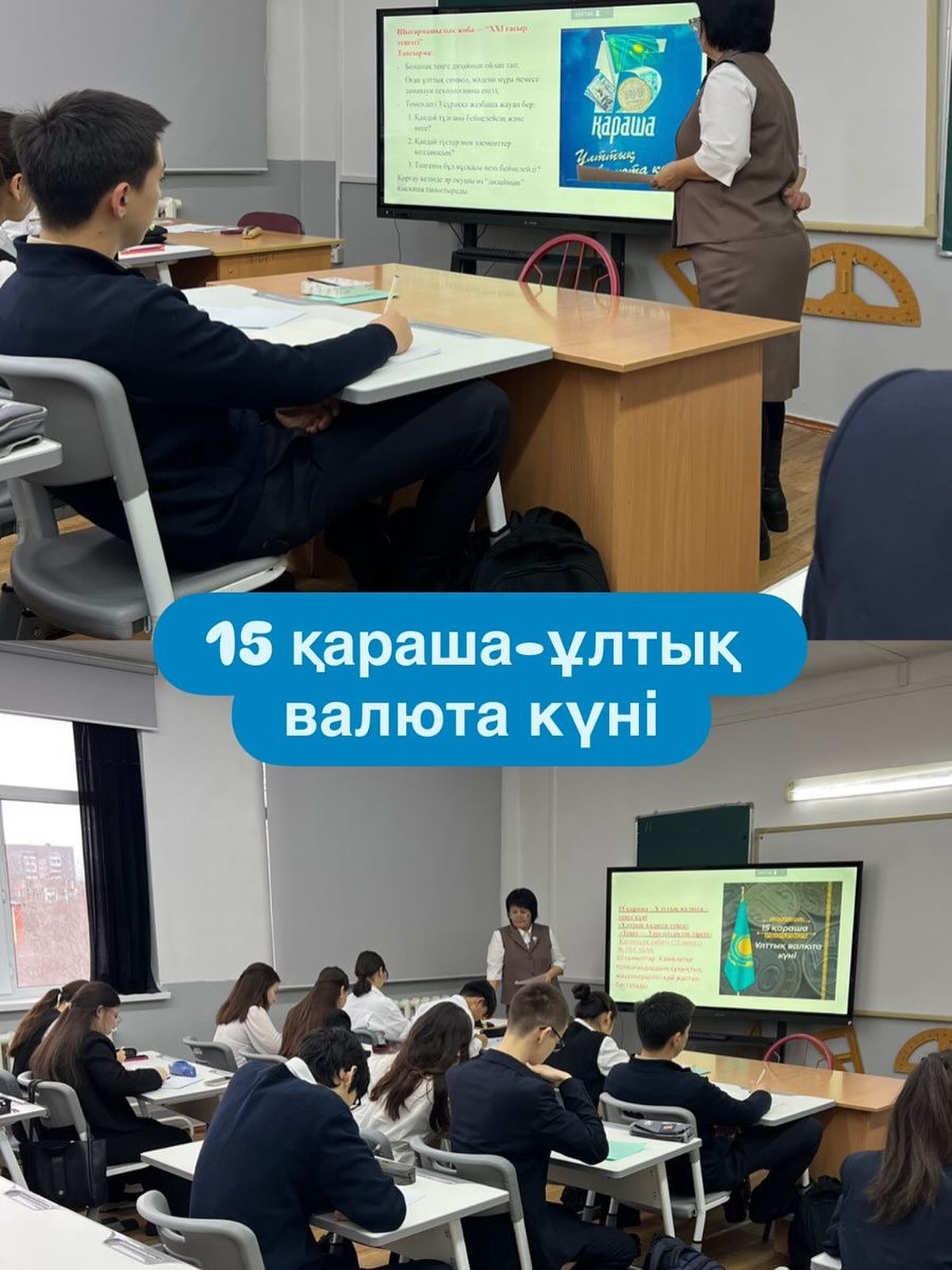 Тәрбие сағатында оқушылар ұлттық валютамыздың тарихымен танысып, теңгенің ел экономикасындағы және тәуелсіз Қазақстанның қалыптасуындағы маңызы жайында мол мағлұмат алды.