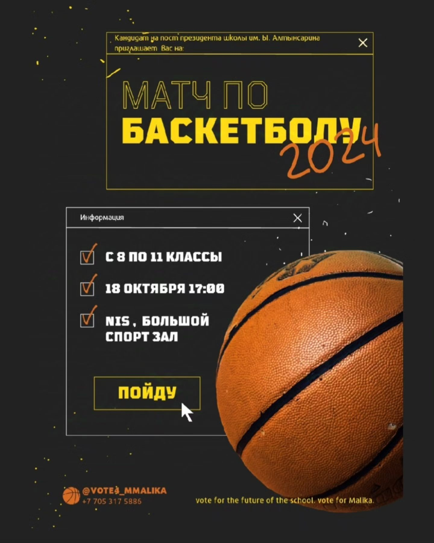 Сәлеметсіз бе! құрметті оқушылар. Президенттікке үміткер Жунуспекова Малика сізді сабақтан тыс уақытта НИШ студенттерімен баскетболдан жолдастық кездесуге қатысуға шақырады. Vote for the future of t…
