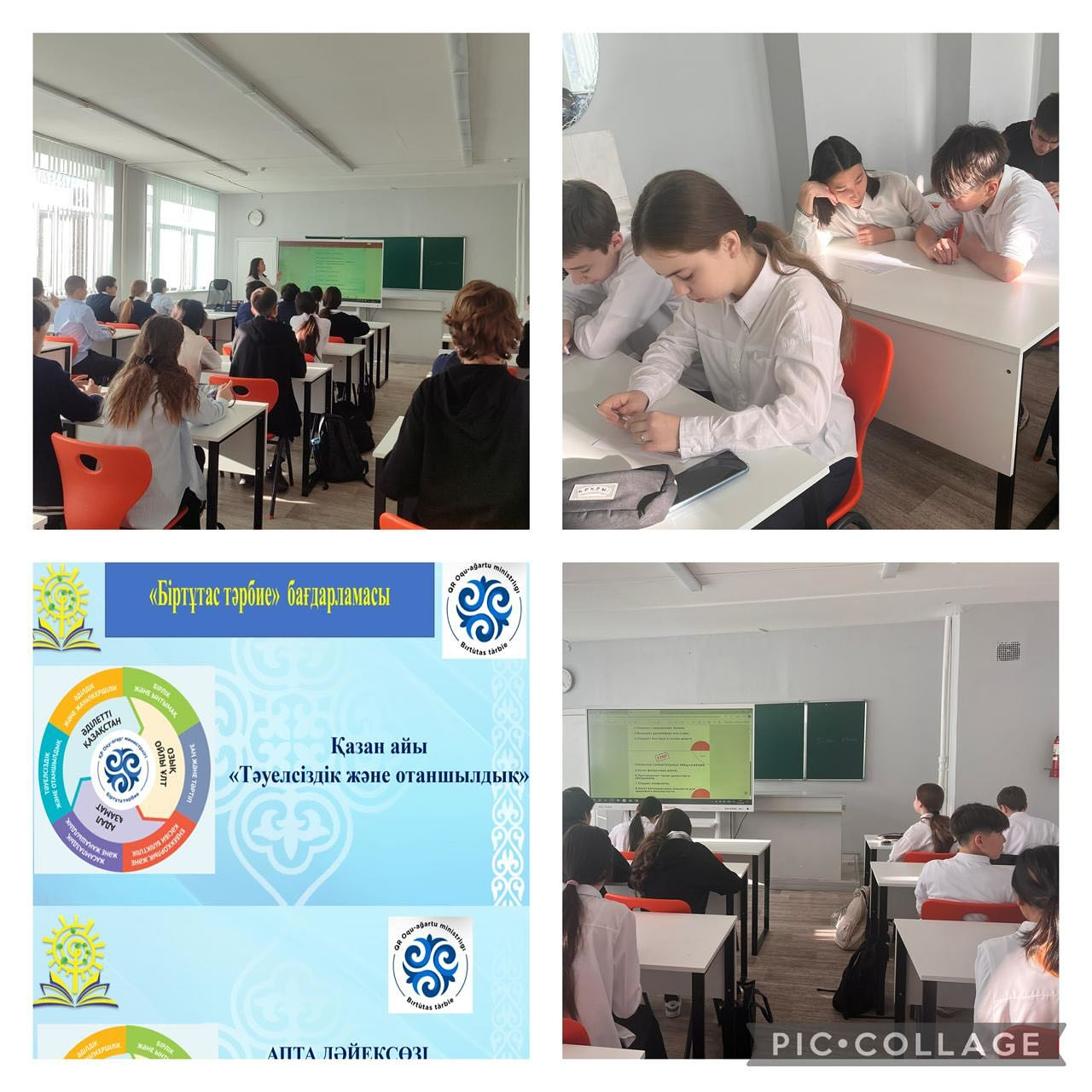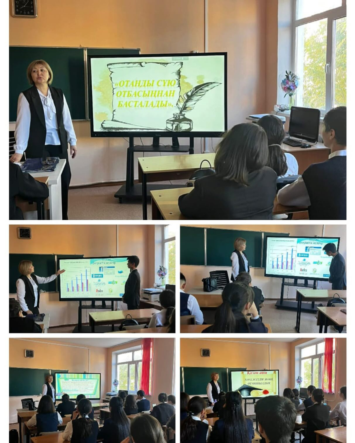 «Біртұтас тәрбие» бағдарламасы. Қазан «Тәуелсіздік және отаншылдық» Апта дәйексөзі: «Отанды сүю – отбасынан басталады!» Бүгін, 9 А сыныбында, «Ц…