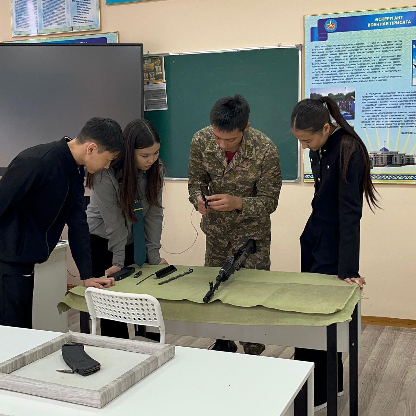 “Жас сарбаз “үйірмесі. 10а сынып оқушылары. Автоматты толық емес бөлшектеу және жинау бойынша, оқжараққа оқты салу жаттығулары. Взвод командир: Бекболатұлы Фараби. АӘТД пәнінің мұғал…