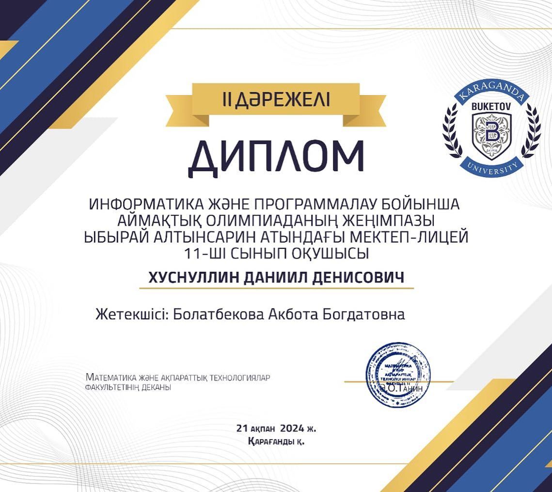 Парламент школы. Фракция “Информация” Муканов Дамир и Хуснуллин Даниил заняли второе место в Региональной олимпиаде по информатике и программированию, которая проходила на базе КарГу им.…