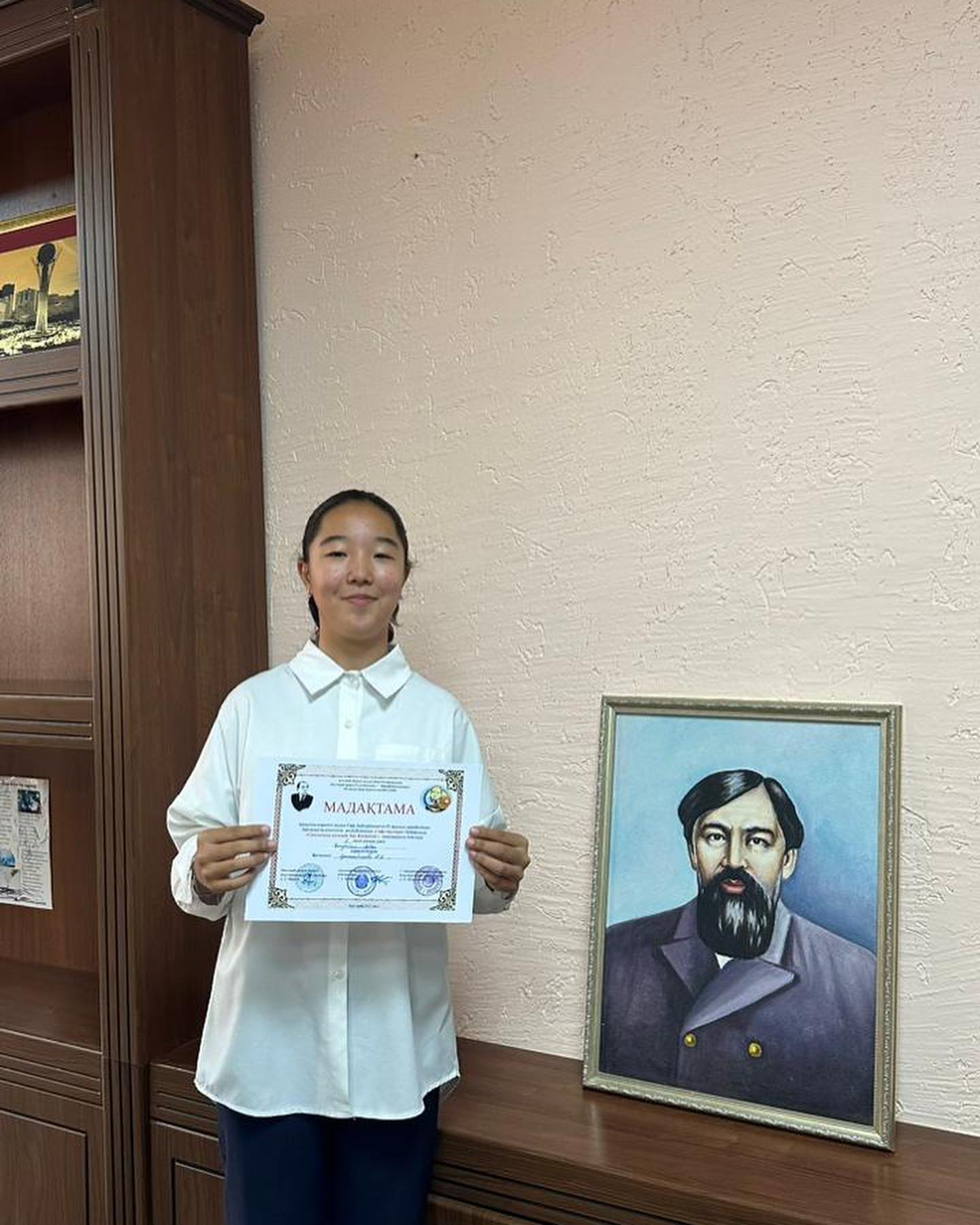 На республиканском конкурсе «Гафуские чтения» в номинации «Отдай руку Сагынышу, Костанай!» 7В-классник Калдыбай Жибек занял 1-е место. Руководитель: Султанбекова А.К.