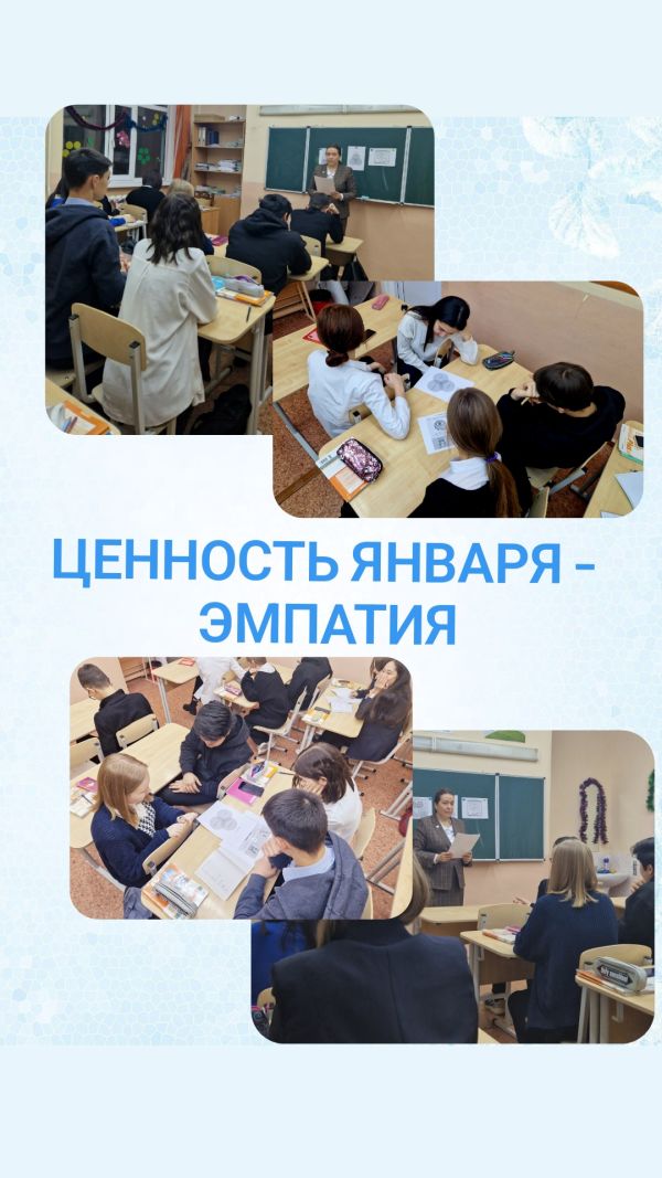 16 қаңтар үні 7а сынып оқушыларында төмендегі тақырыптар бойынша сынып сағаты өтті: 1)“Эмпатия” құндылығы бойынша әңгіме 2)“Интернеттегі медиа қауіпсіздігі”