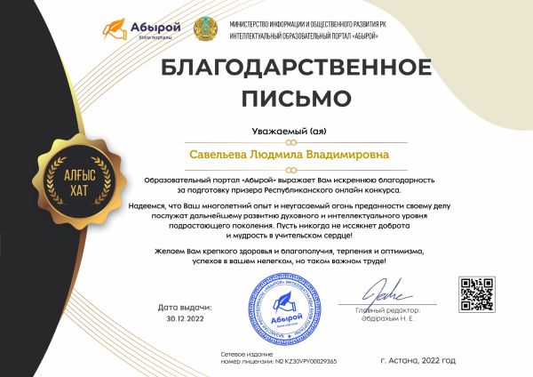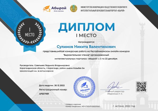 Ученик 3Е класса Сулимов Никита принял участие в дистанционном Республиканском творческом конкурсе портала знаний "Абырой" на тему " Выразительное чтение" и занял 1 место. Стихот…