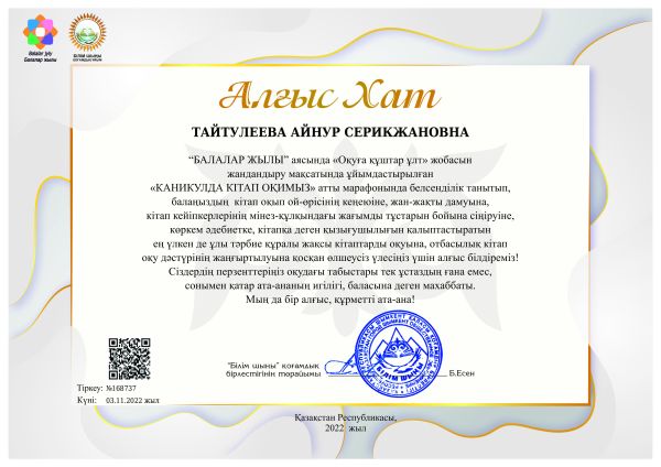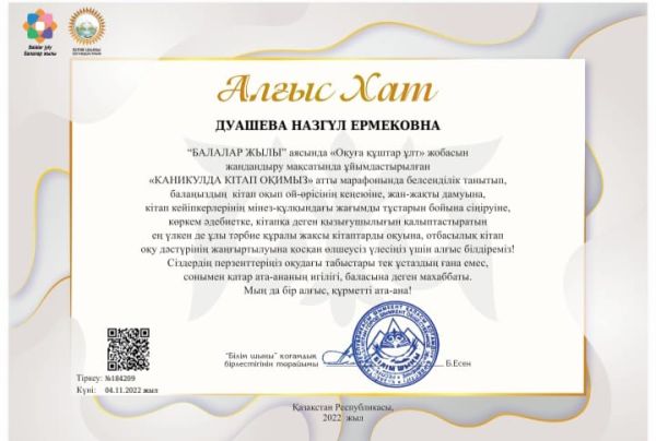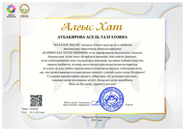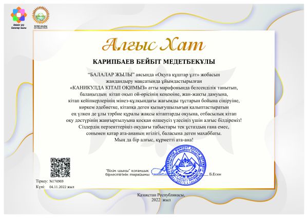 2-11қазақ сыныптары оқушыларына арналған «КАНИКУЛДА КІТАП ОҚИМЫЗ» атты республикалық марафонына қатысқан 4 «А» сынып оқушылары мен ата-аналарына алғыс білдіреміз. Сондықтан д…