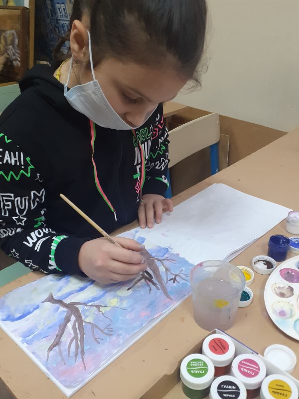 Проведено индивидуальное занятие с ученицами 2-3 класса по кружку " Палитра ".Выполнен рисунок красками " Зима ." Учитель Скорикова М.П.
