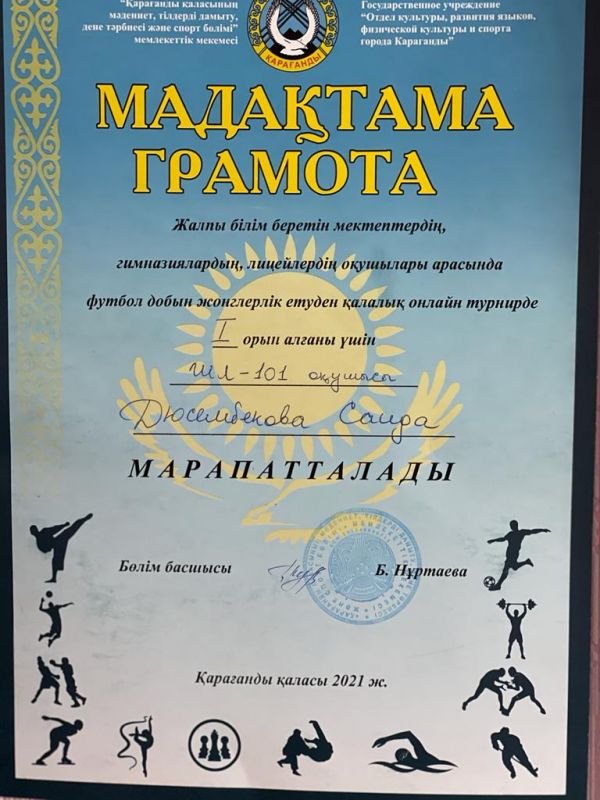 Поздравляем ученицу 6 "Е" класса Дюсембекову Саиду, которая заняла 1 место по онлайн набиванию мячей среди школ гимназий и лицеев