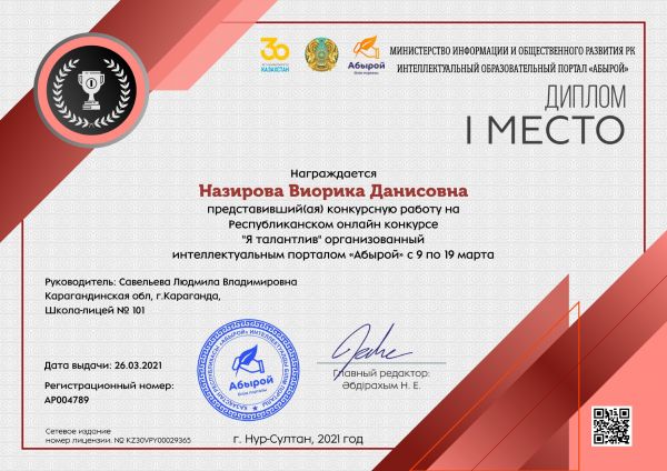 Поздравляем ученицу 1 - Е класса Назирову Виорику с призовым первым местом в Республиканском онлайн конкурсе "Я талантлив", организованный интеллектуальным порталом " Абырой".